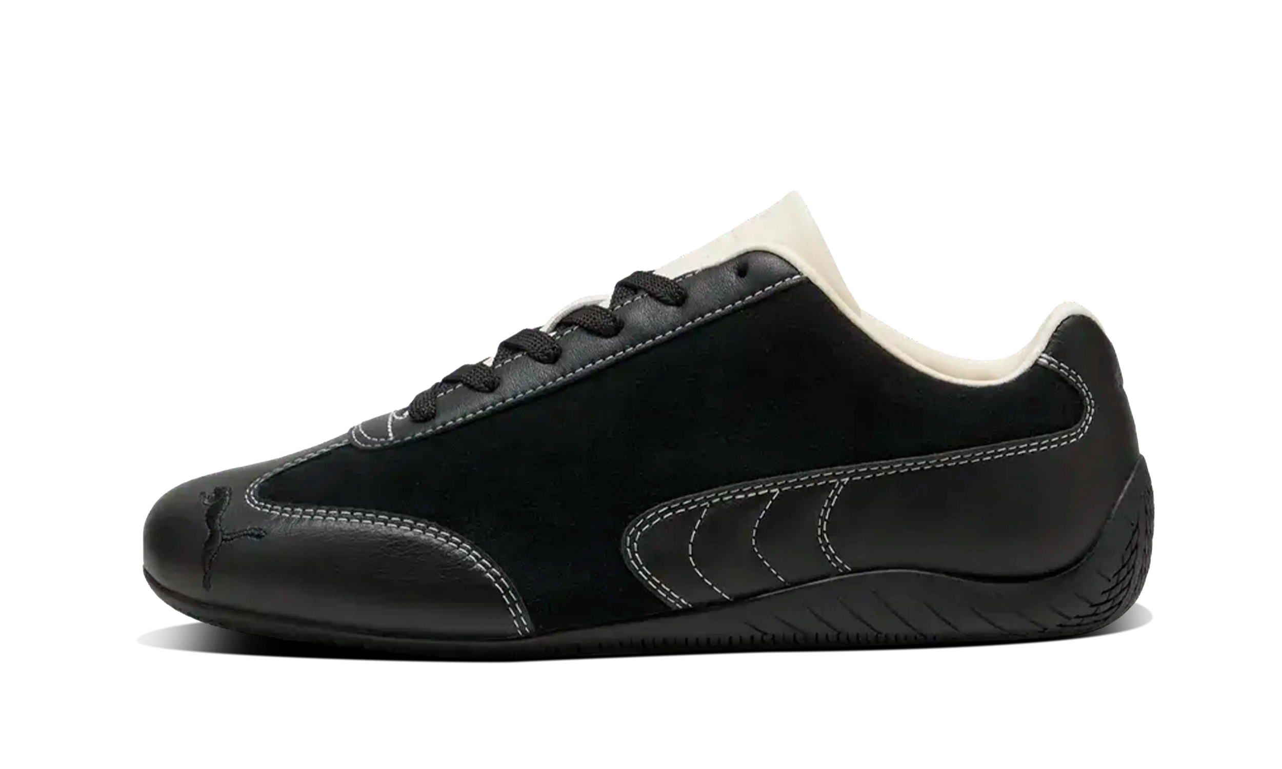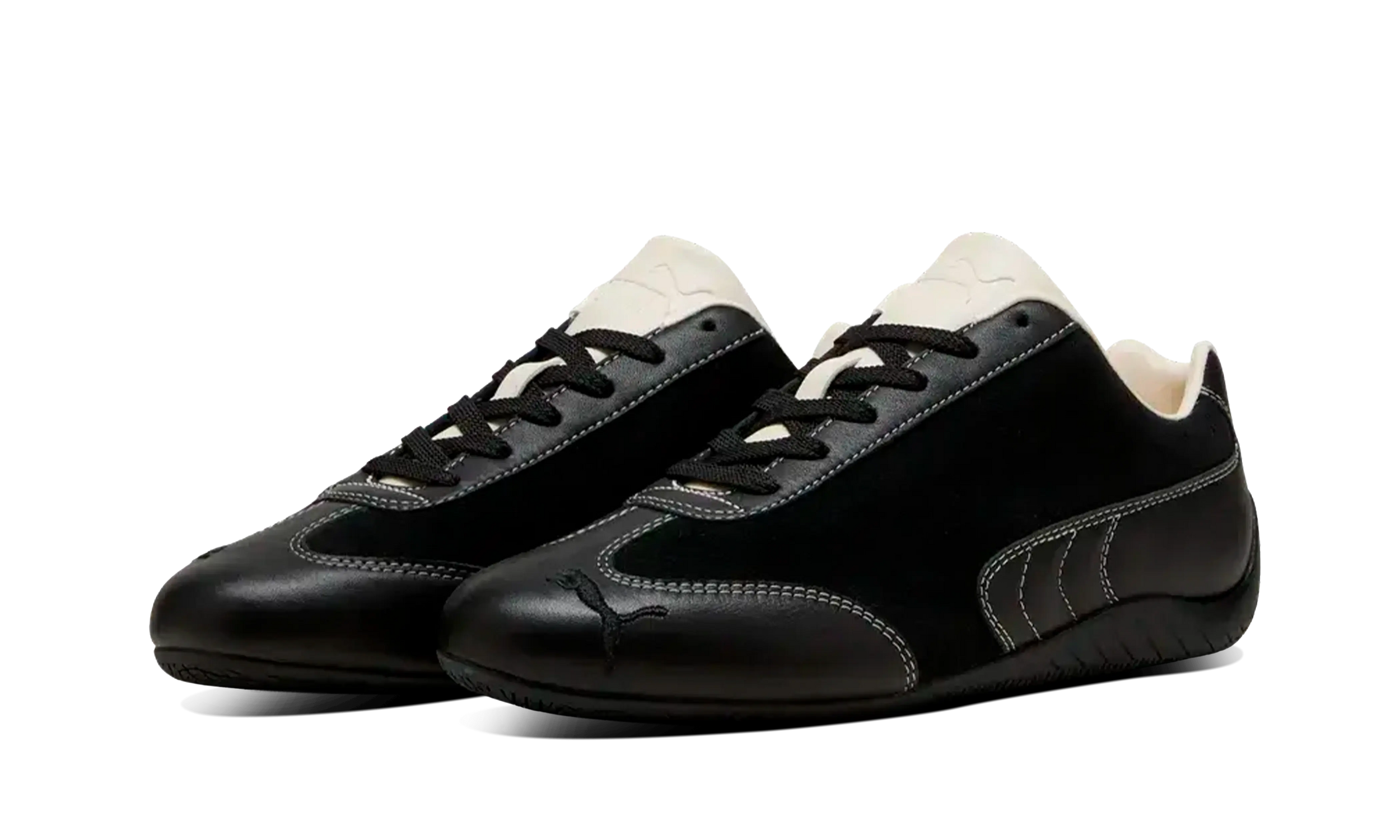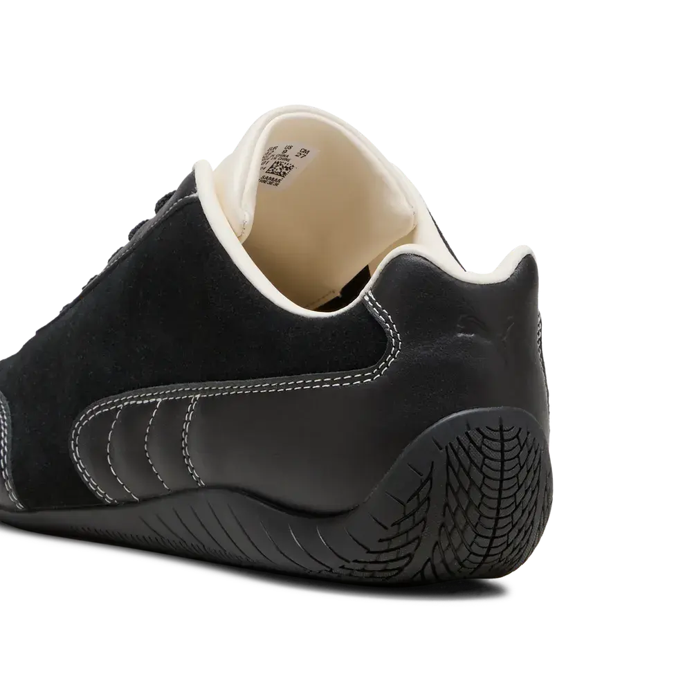 Lifestyle sneaker footwear inspired by the look of racetracks and the heritage of PUMA Speedcat, reimagined in a Black/Frosted Ivory color scheme with a low-profile design and refined details for everyday city use.